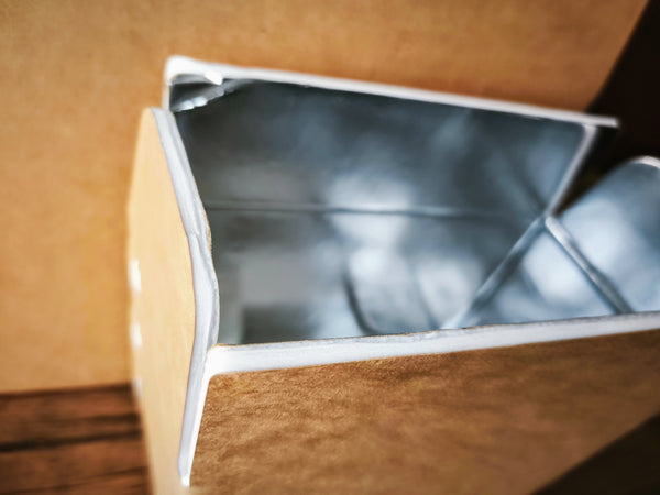 Caja con revestimiento interior de aluminio, ideal para conservar productos protegidos del calor, la humedad o la luz. Perfecta para alimentos, cosméticos u otros artículos que requieren una barrera adicional.